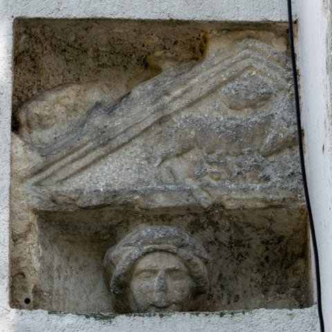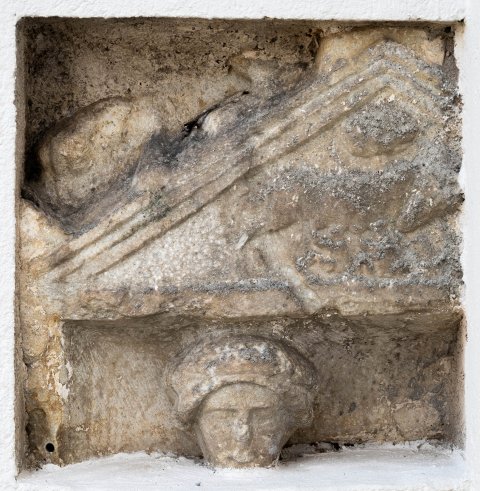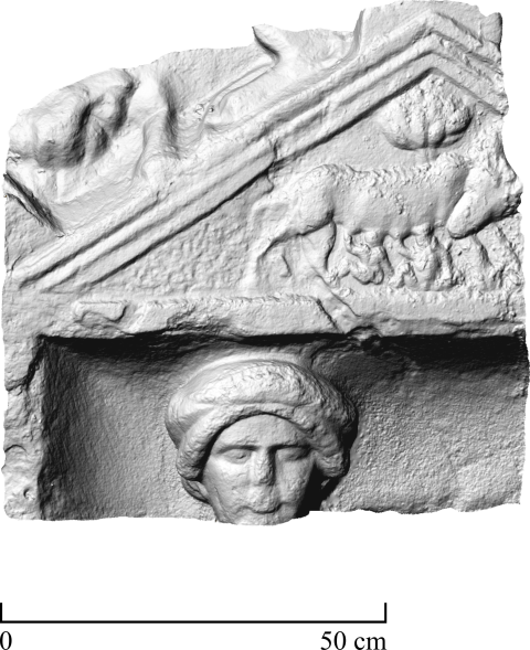 - Stelenfragment mit Porträt einer einheimischen Frau mit Haube. Im Giebel Mythos (Lupa Capitolina), auf der Giebelecke Rest eines liegenden Löwen.