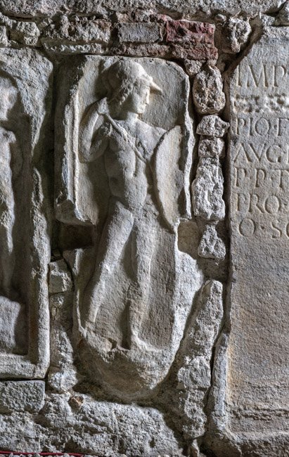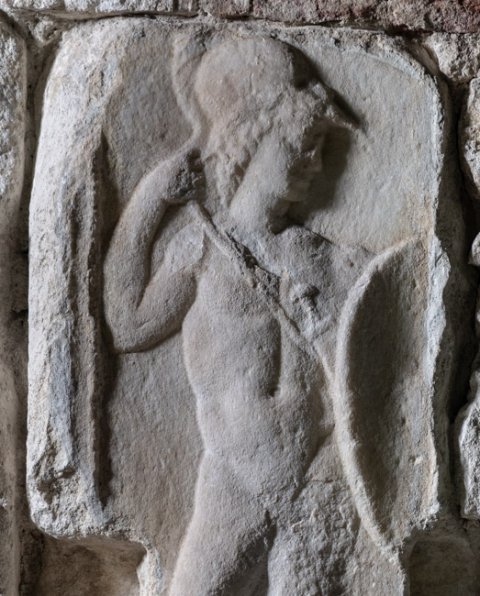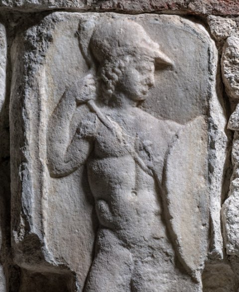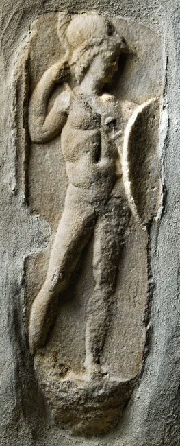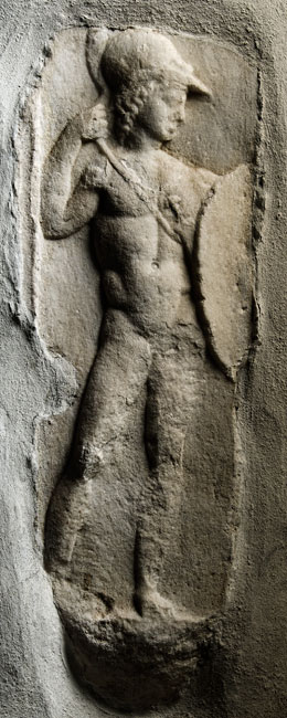 - Mythische Figur (Mars, Heros ?): Jüngling mit Waffen: Helm, Schild, Schwertgurt (Balteus), Schwert.
