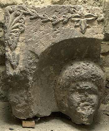 - Tiefe ungerahmte Bogennische, darin Kopf eines jungen Mannes (?). Über der Nische Girlande, in der Ecke Halbpalmette, darunter Rest eines Pflanzenornaments.
