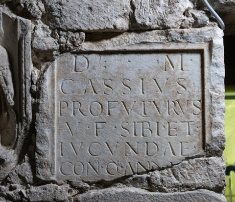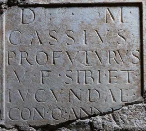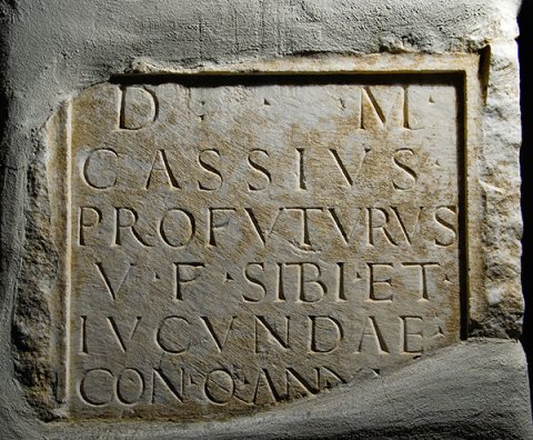 - D(is) M(anibus) / Cassius / Profuturus / v(ivus) f(ecit) sibi et / Iucundae / con(iugi) o(bitae) an(norum) XV[---