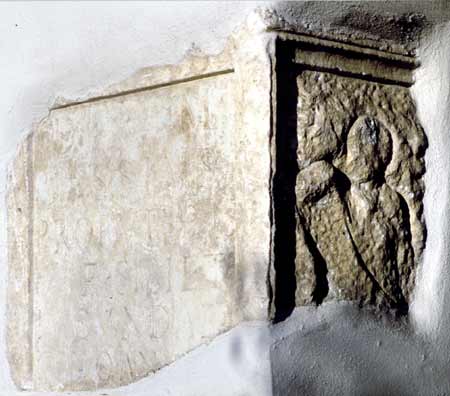 - unten abgebrochen, Rückseite flächig zugerichtet, linke Nebenseite mit profilgerahmtem Feld eingemauert, Relief der rechten Nebenseite nicht fertiggestellt