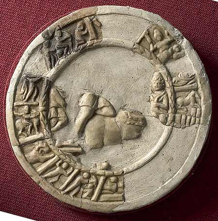 - Mythos (Mithras): runde Scheibe, im Mittelbild Stiertötung (Tauroktonie) mit Cautes und Cautopates, am Rand umlaufend einzelne Bilder mit Szenen des Mithrasmythos.