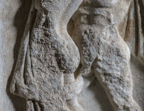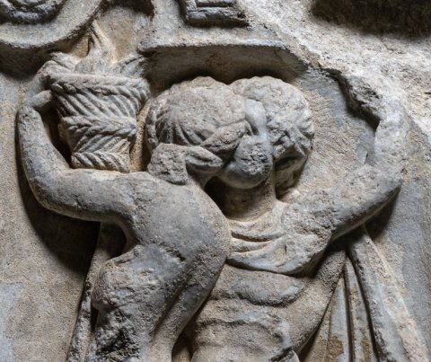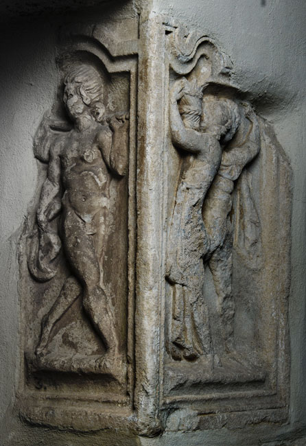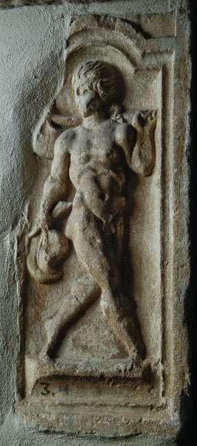 Auf der linken Nebenseite mythische Figur: in Bogennische auf niedrigem Podest nackter Satyr, in der Rechten Schlauch, mit der Linken schultert er Pedum mit Jagdbeute.