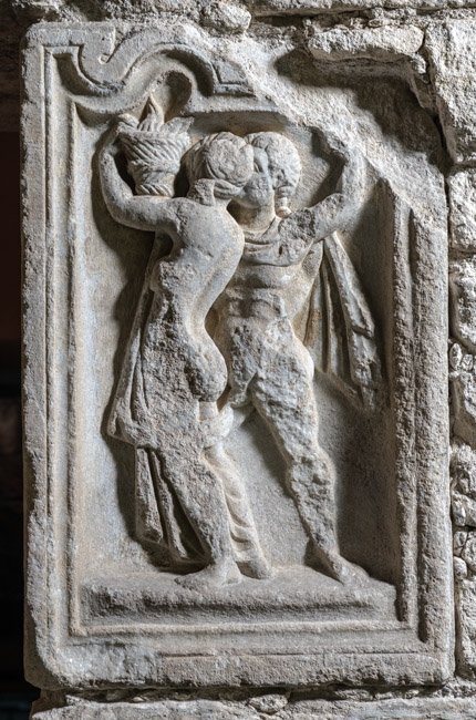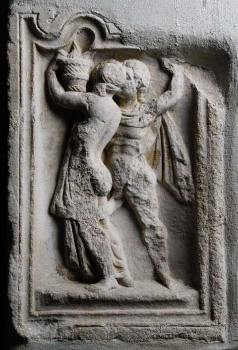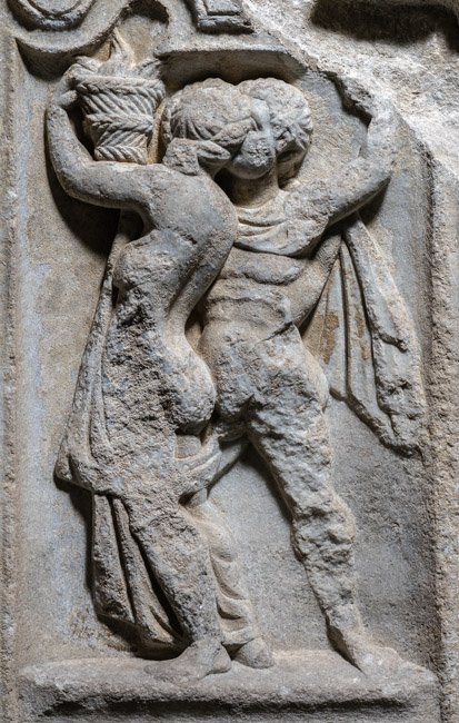 Eckblock: auf der Vorderseite mythische Figuren: auf flachem Podest Mänade in Rückenansicht mit entblößtem Körper, Mantel um die Beine, Korb mit Früchten im erhobenen linken Arm. Von rechts umarmt sie ein Satyr mit spitzen Ohren, erhobenem linken Arm und über den Rücken hängendem Mantel. Oberer Rahmen mit Volutenenden.