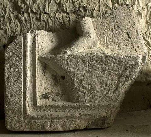 - Rechteckiges Bildfeld mit profiliertem Rahmen. Sichtbar nur der rechte Fuß einer Figur auf einem niedrigen, nach oben zu ausladenden Podest. Die Figur schreitet nach links hin aus.