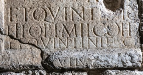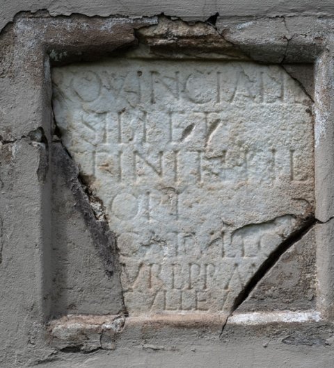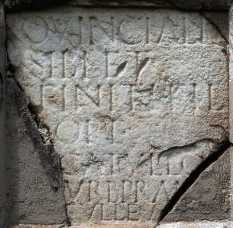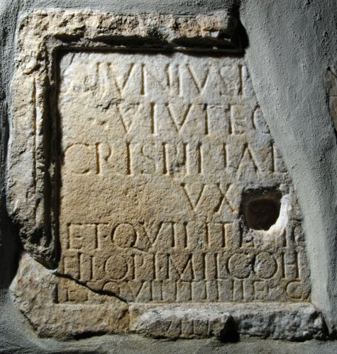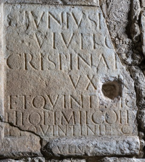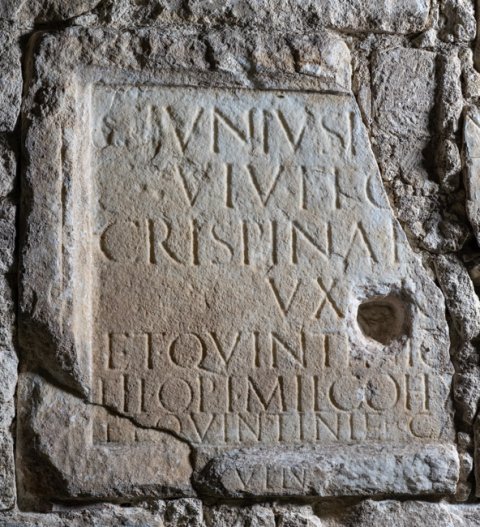 - C(aius) Iunius Provincialis / viv(us) fec(it) sibi et / Crispinae Finiti fil(iae) / uxor(i) opt(imae) / et Quintinio Catullo / fil(io) opt(imo) mil(iti) coh(ortis) X urb(anae) P(iae) F(idelis) An[t(oninianae)] / et Quintini(a)e Catull(a)e a[n(norum) ---] / [--- Q]uin[t---