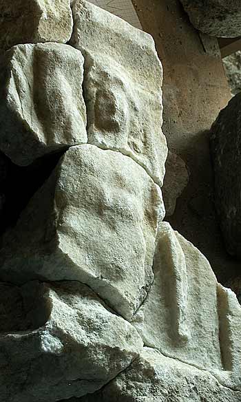 - Mythische Figur: Oberkörper einer nach rechts hin gelagerten (?) männlichen Figur mit nacktem Oberkörper und langen Locken, linker Arm über den Kopf gelegt (Endymion ?). Links weitere Reliefreste. Oben und rechts glatte Rahmenleiste, rechts untere linke Ecke eines Feldes mit profliertem Rahmen.