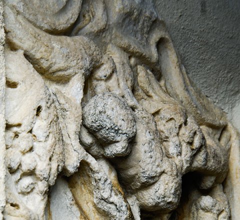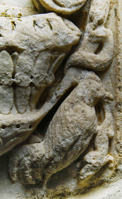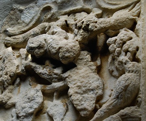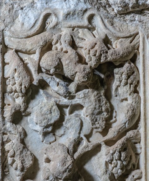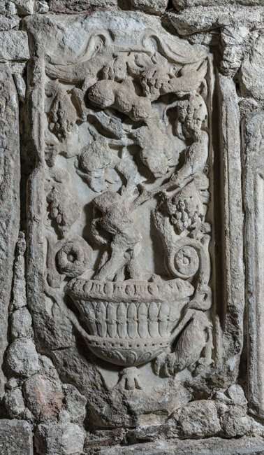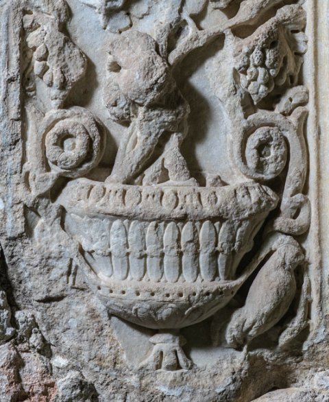 - Eckblock: Vorderseite (?): Schmales Feld mit oben geschwungenem, profiliertem Rahmen. Volutenkrater mit Weinstock und Tieren: rechts vom Krater Hahn mit Eidechse, auf den Henkeln Schlangen, im Weinstock Hase (?) und Vögel. Nebenseite: Relief an der eingemauerten linken Nebenseite.