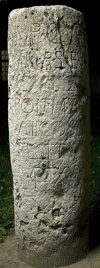 - Imp(erator) Caes(ar) / M(arcus) Aur(elius) Severus / [[Alexander P(ius) F(elix) Aug(ustus)]] / pont(ifex) max(imus) trib(unicia) pot(estate) / VIIII co(n)s(ul) III pat(er) pat(riae) / restituit ab Aq(uinco) m(ilia) p(assuum) XXXVIIII
