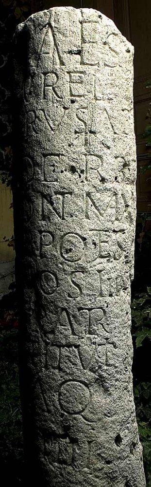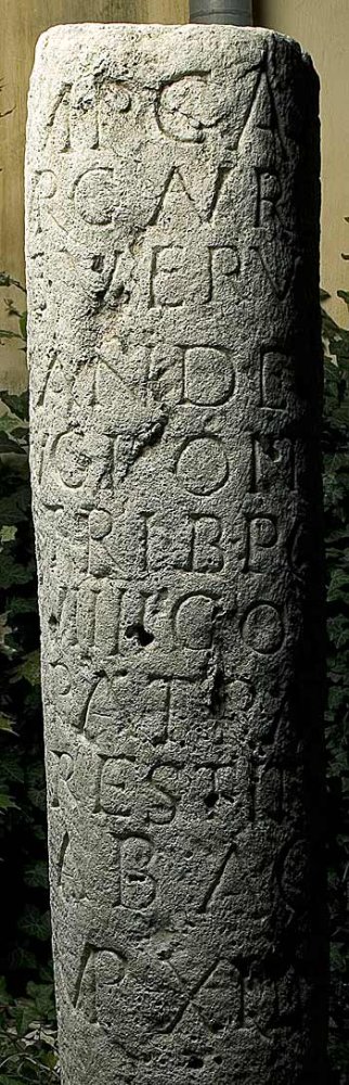 - Imp(erator) Caes(ar) / Marc(us) Aurel(ius) / Severus Ale/xander P(ius) F(elix) / Aug(ustus) pont(ifex) max(imus) / trib(unicia) potes(tate) / VIIII co(n)s(ul) III / pat(er) patr(iae) / restituit / ab Aq(uinco) m(ilia) p(assuum) X<L>IIII