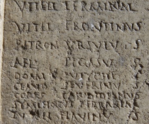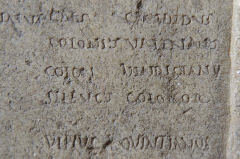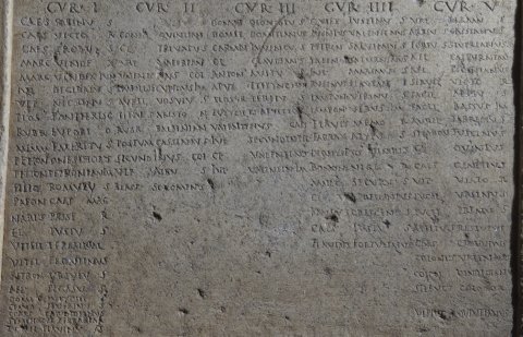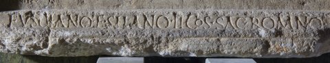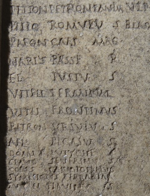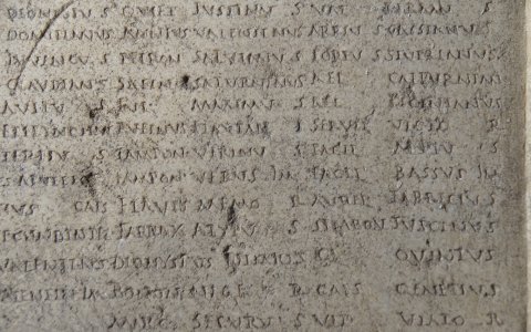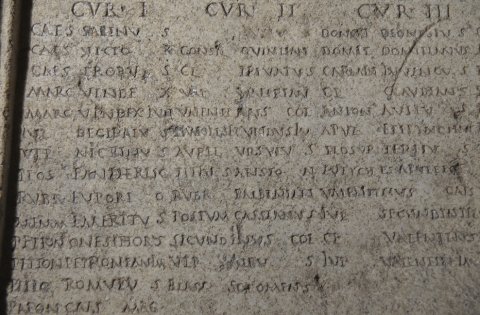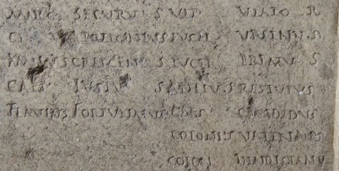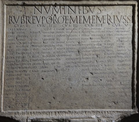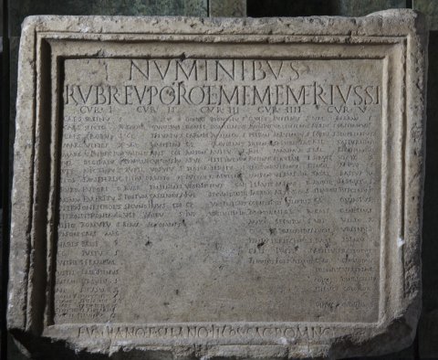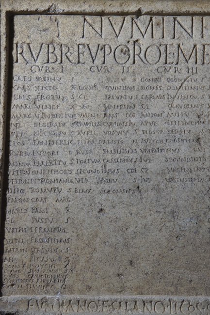 - Numinibus / Rubr(ius) Euporio et Mem(mius) Emeri(tus) iussi // cur(ia) I / Caes(ius) Sabinus / Caes(ius) Victor / Caes(ius) Probus / Marc(ius) Vindex / Marc(ius) Vindex Iun(ior) / Iul(ius) Decibalus / Ulp(ius) Nigrinus / Plos(urnius) Pantherisc(us) / Rubr(ius) Euporio / Memm(ius) Emeritus / Petron(ius) Onesiphorus / Petron(ius) Petronian(us) im(munis) / Petio(!) Romulus / Paeon(ius) Caes(i) Mag(ni) / Narius Passer / Fl(avius) Iustus / Vitell(ius) Terminal(is) / Vitel(lius) Frontinus / Petron(ius) Ursulus / Ael(ius) Pegasus / Domit(ius) Eutyches / Claud(ius) Severinus / Cons(tantius?) Candidianus / Symphorus Terrasia / Turel(lius) Flavinus // cur(ia) II / [[---]] Iustus / Consil(ius?) Quintian(us) / Cl(audius) Privatus / Val(erius) Valerian(us) / Valentinus col(onorum) / Manil(ius) Secundus im(munis) / Aurel(ius) Ursulus / Titius Ariston / Rubr(ius) Balbinian(us) / Postum(ius) Cassianus / Secundinus col(onorum) / Ulp(ius) Albus / Blass(ius) Sozomenus // cur(ia) III / Domit(ius) Dionysius / Domit(ius) Domitianus / Carmin(ius?) Iuvencus / Cl(audius) Claudianus / Anton(ius) Avitus) / Apul(ius?) Epitynchan(us) / Plosur(nius) Tertius / Eutyches Apulei(us) / Valentinus Caes(i) / Iul(ius) Secundin(us) Pel(idianus) / Cl(audius) Valentinus / Iul(ius) Valentin(us) im(munis) // cur(ia) IIII / Quiet(ius) Iustinus / Annius Valentinus / Petron(ius) Salvianus / Saein(ius?) Saturninus / Iul(ius) Maximus / Rufinus Flavian(us) / Lampon(ius) Verinus / Lampon(ius) Verus im(munis) / Flavius Memor / Farrax Alypus / Dionysius Vimior / Bonon(ius) Niger / Marc(ius) Securus / Cl(audius) Apollonius / Kanius Crescens / Caes(ius) Iustus / Flavius Fortunatus // cur(ia) V / Val(erius) Firmus / Arrius Cassianus / Torius Severianus / Ael(ius) Calpurnian(us) / Ael(ius) Licinianus / Servil(ius) Victor / Pacil(ius) Attius / Pacil(ius) Bassus im(munis) / Aurel(ius) Fabricius / Stlabon(ius) Fuscinus / Cl(audius) Quintus / Caes(ius) Genetius / Ulp(ius) Viator / Lucil(ius) Ursinus / Lucil(ius) Primus / Atilius Restutus / Caes(ius) C[a]ndidus / Colonius Valerianus / Colon(ius) Vindicanu(s) im(munis) / Seleucus colonor(um) / Ulpius Quintianus // Fusciano et Silano II co(n)s(ulibus) sac(erdote) Romano