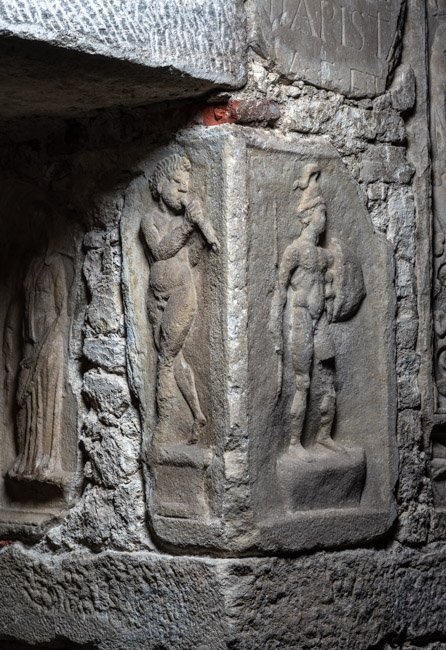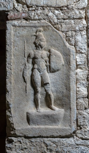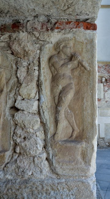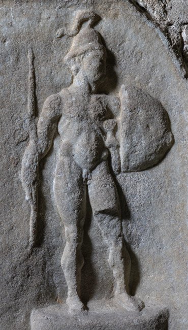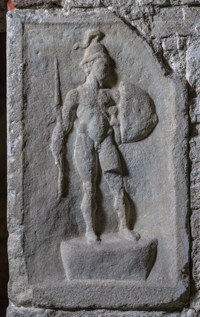 Mythische Figur, Musikinstrument. Eckblock: auf der Vorderseite auf Podest nackter Jüngling (Mars, Heros ?) mit Waffen: Helm, Balteus, Schwert, in der Rechten Lanze, in der Linken Schild.