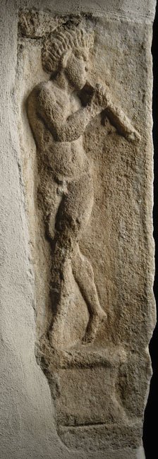 Auf der linken Nebenseite auf Podest Flöte spielender nackter Satyr mit spitzen Ohren.