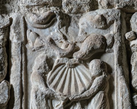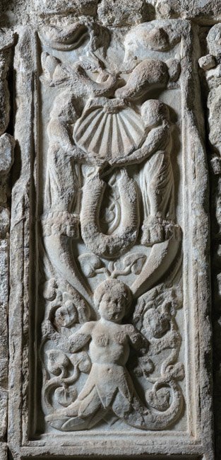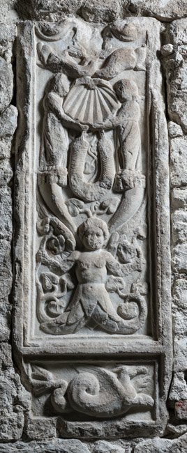 - Hochrechteckiges Feld, oben geschwungener Rahmen, darin unten geflügelte Rankenfrau, über ihr zwei Füllhörner, auf denen je ein Mädchen in langem Gewand steht. Sie halten eine Muschel zwischen sich. Unter der Muschel Girlande (Isisgirlande ?), über der Muschel zwei Delphine. Unten rechteckiges Sockelfeld mit Meerwesen (Seedrache).