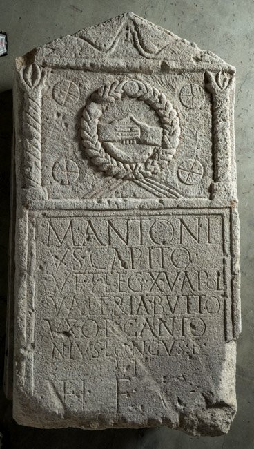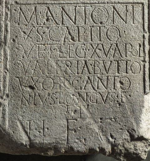 - M(arcus) Antoni/us Capito / vet(eranus) leg(ionis) XV Apol(linaris) / Valeria Butto / uxor C(aius) Anto/nius Longus f(ilius) / et / h(eres) f(aciendum) c(uravit)