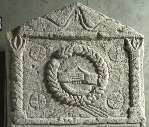 - Im Giebel zwei Delphine. Im Hauptbild zwischen Säulen Kranz, darin verschränkte Hände, außen vier Rosetten.