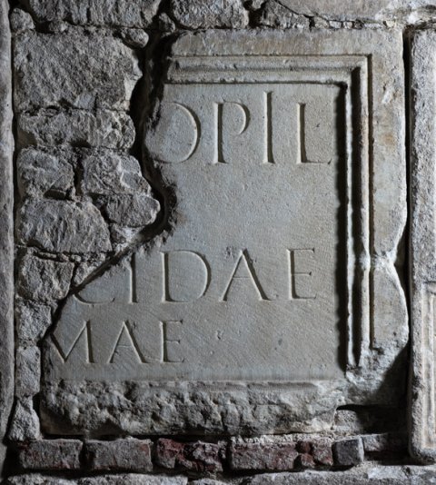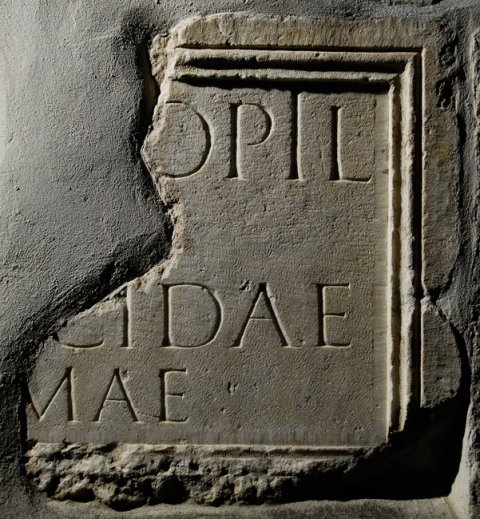 - Der Frauenname in Z3 lässt sich in Placidiae oder in Lucidiae auflösen; unter der Annahme, dass Z4 keine Abkürzungen enthält, lässt sich mit der Ergänzung “uxori optimae” die Mindestbreite des Steins rekonstruieren (kürzer als etwa “coniugi/marito” bzw. carissimae), 216 cm. Angesichts der großen Breite des Steins wird es sich bei dem Namen in Z1 wohl um ein Cognomen handeln, da davor ausreichend Platz ist. Gegen die bisherige Lesung als [prim]o pil(o) spricht neben dem fehlenden Abstand zwischen O und P die Frage nach dem Platz für den Namen des Mannes.