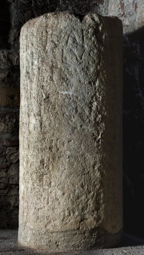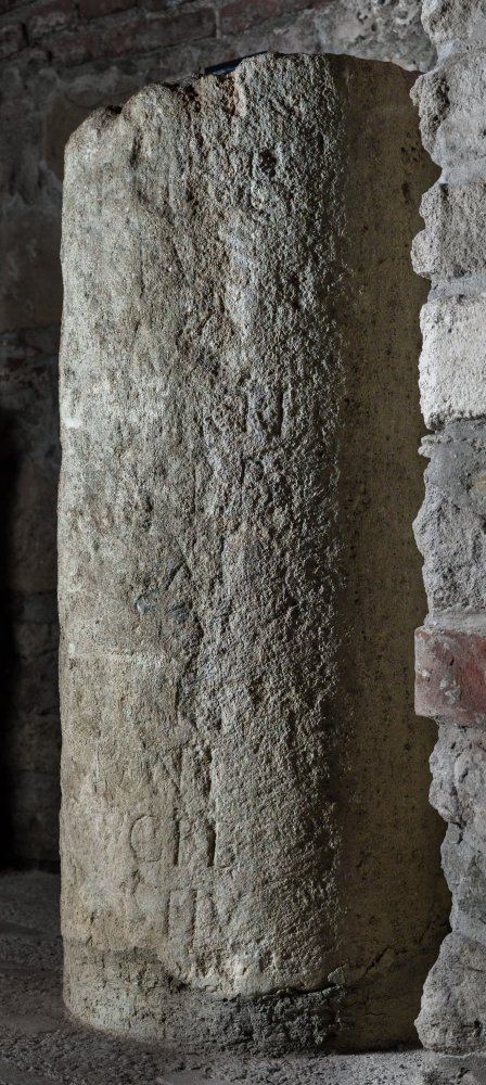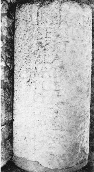 - Imp(erator) Caes(ar) L(ucius) Sept(imius) / Severus Pius / Pertina[x] Aug(ustus) / Arab(icus) [Adiab(enicus)] Parth(icus) / maximus pon[t(ifex) m(a)x(imus)] trib(unicia) / potest(ate) [IX] imp(erator) XI / co(n)s(ul) II proco(n)s(ul) / p(ater) p(atriae) et Imp(erator) [Cae]s(ar) M(arcus) / Aurel(ius) [Ant]oni/nus Pius Aug(ustus) Fe/lix [trib(unicia) pote]st(ate) IV / [--- et P(ublius?) Se]p/[timius Geta ---