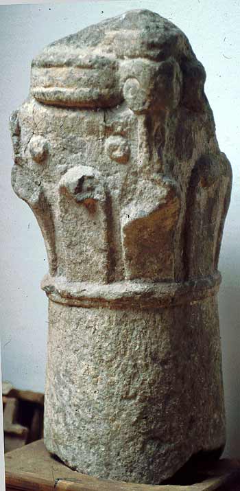 - Glatter Säulenschaft mit angearbeitetem Blattkapitell mit Eckvoluten.