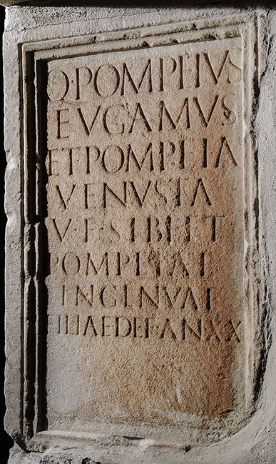 - Q(uintus) Pompeius / Eugamus / et Pompeia / Venusta / v(ivi) f(ecerunt) sibi et / Pompeiae / Ingenuae / filiae def(unctae) an(norum) XX