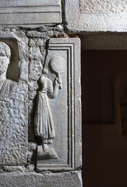 - Auf der linken Nebenseite in Rechteckfeld auf niedrigem Podest Dienerin in Unterkleid und gegürtetem Obergewand, in der Linken Spiegel.