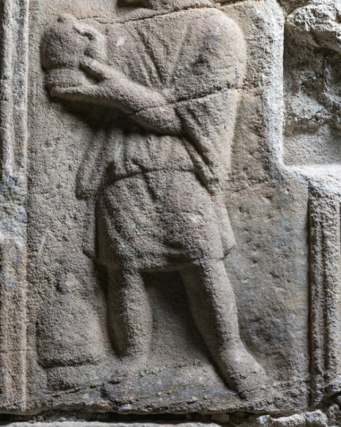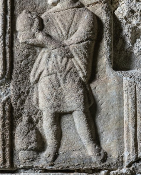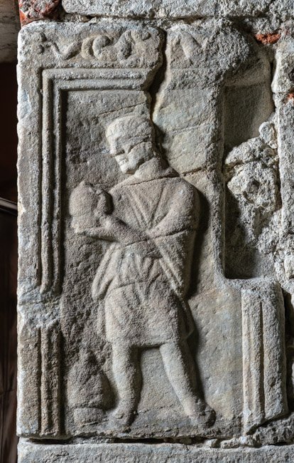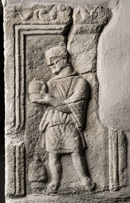 Auf der rechten Nebenseite in Rechteckfeld Diener in kurzer Tunica, in den Händen und neben dem rechten Fuß Schröpfkopf. Auf dem Rahmen oben zwei Meerwesen (Seedrachen). - Inschrift