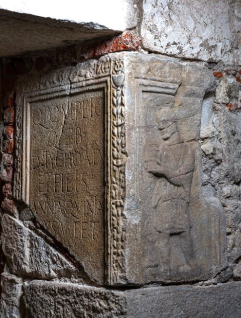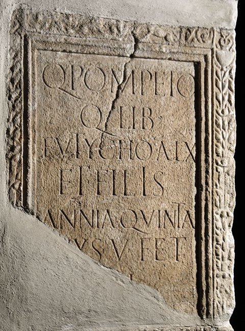 - Q(uinto) Pompeio / Q(uinti) lib(erto) / Eutycho a(nnorum) LX / et fili(i)s / Annia Quinta / uxs(or)(!) v(iva) f(ecit) et / [sib]i