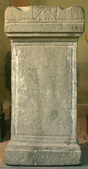- Volutenpolster (pulvini), dazwischen durch Ritzlinien angedeuteter Giebel. Schriftfeld gerahmt.