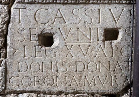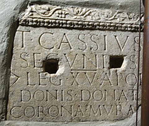 - T(itus) Cassius / Secundus / (centurio) leg(ionis) XV Apol(linaris) / donis donat(us) / corona mural[i] / phaler(is) torquib(us) / armillis t(estamento) f(ieri) i(ussit) / arbitr(atu) M(arci) Saxi Primi / h(eres) f(aciendum) c(uravit) / l(ocus) s(epulturae) d(atus) d(ecreto) d(ecurionum)