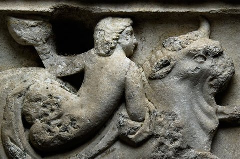- Meerwesen (Seethiasos): Seestier, auf dem Rücken lagernde Nereide mit entblößtem Körper, mit dem rechten Arm aufgestützt, in der erhobenen Linken große Schale. Vor dem Stier weiteres Meerwesen.
