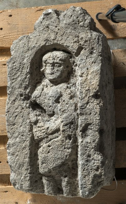 - In schmaler Bogennische Ganzfigur eines bartlosen Mannes im Mantel.