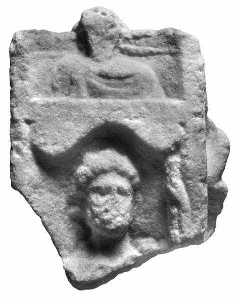 - Zwei Bildfelder übereinander. Oben Büste eines Mannes im Sagum, über der Stirn Bohrlöcher (für Metallkranz ?). Unten Nische mit Bogenabschluss, darin Kopf und Schulterpartie eines Mannes mit Lanze oder Szepter in der erhobenen Linken. Auf der rechten Nebenseite Reliefrest.