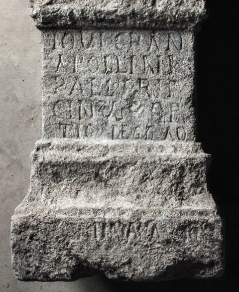 - Iovi Gran(no) / Apollini / P(ublius) Ael(ius) Pris/cinus op/tio leg(ionis) II ad(iutricis) // [[[Imp(eratore) Commodo VI]]] // et Septimia(no) co(n)s(ulibus)