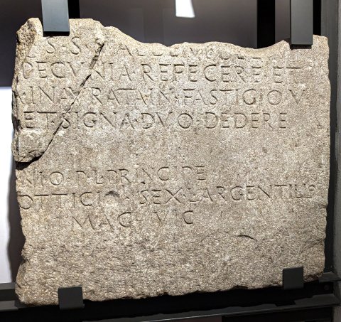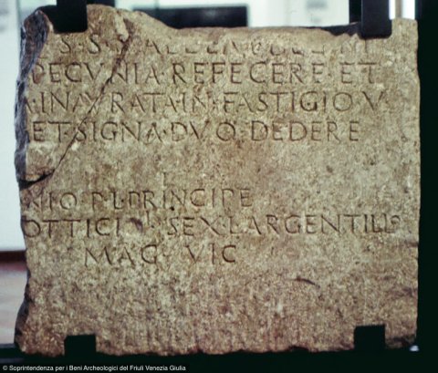 - [mag(istri) q(ui)] s(upra) s(cripti) s(unt) aedem Belini / [de su]a pecunia refecere et / [clu]pea inaurata in fastigio V / et signa duo dedere / [P(ublio) Erbo]nio P(ubli) l(iberto) Principe / [Sex(to) V]otticio Sex(ti) l(iberto) Argentillo / mag(istris) vic(i)