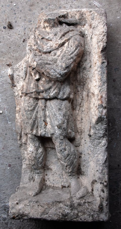 - Mythos (Mithras): beidseitig reliefierte Platte. Auf der Seite mit rechtem Rand stehender Mann (Cautes ?) in orientalischer Tracht (Kopf und Hände fehlen). Auf der anderen Seite ebensolche Figur, die in der linken Hand einen Stab mit dem aufgespießten Stierkopf (?) hält. Darüber Reliefrest mit Stierschwanz.