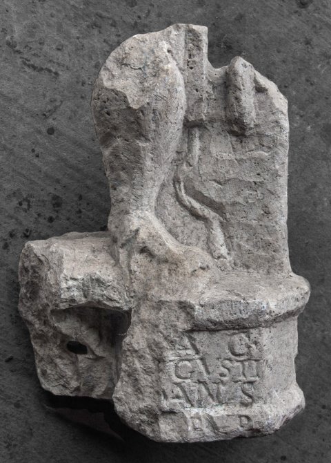 - Mythische Figur. Sockel mit vorspringender Leiste oben und unten, die erhaltene rechte Seitenfläche setzt im stumpfen Winkel an. Von der Figur nur nackter linker Unterschenkel erhalten, Reliefrest daneben (Stuhlbein ? Bogen ?).