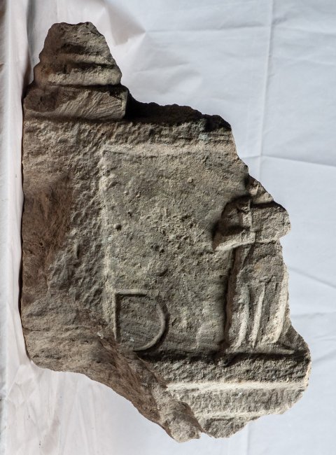 - Rest eines Zwischenbildes mit Totenopfer (Dienerin) und Inschriftbeginn (Dis Manibus). Darüber Säulenbasis vom Rahmen des Hauptbildes, unten Ansatz des gerahmten Schriftfeldes.