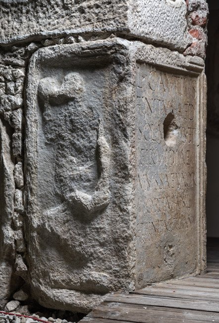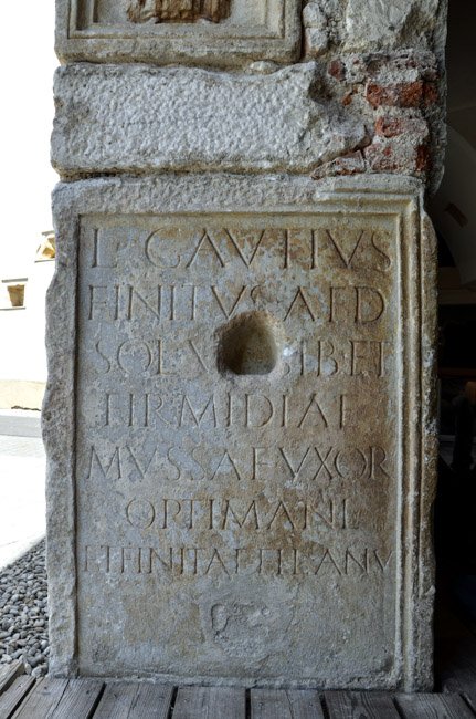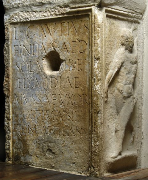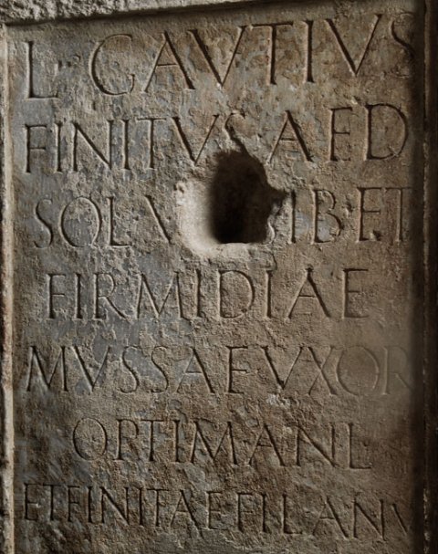 - L(ucius) Gautius / Finitus aed(ilis) / Sol(vae) v(ivus fecit) sib(i) et / Firmidiae / Mussae uxor(i) / optim(ae) an(norum) L / et Finitae fil(iae) an(norum) V