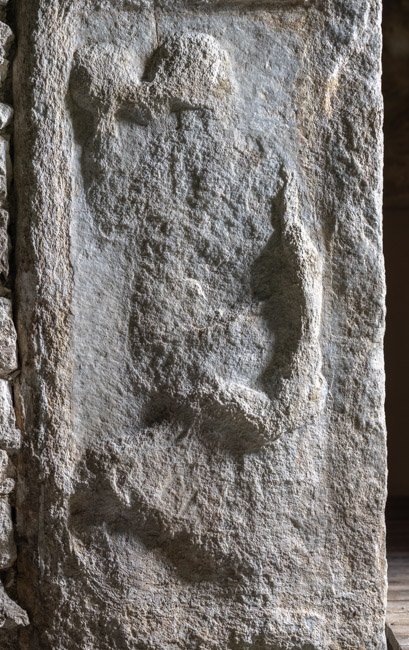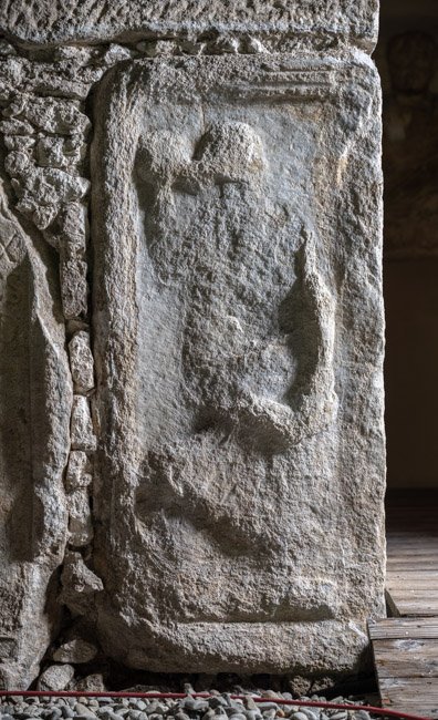 - Ober- und Unterseite glatt (fein gespitzt), Rückseite glatt (fein gespitzt), zwei Zangenlöcher im Inschriftfeld (davon eines mit Mörtel verschlossen), Relief der linken Seite stark verwittert