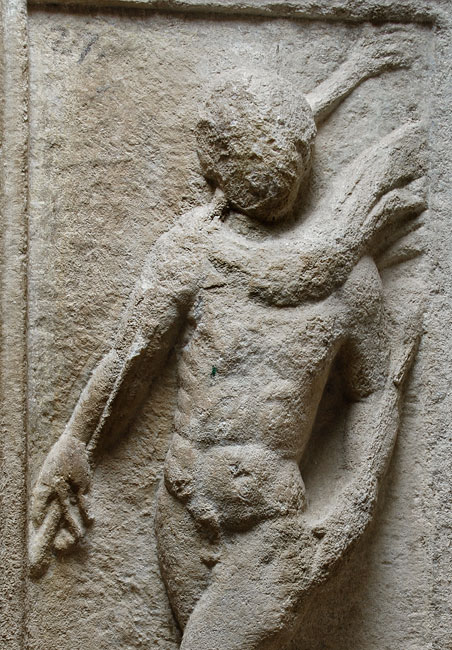 Auf der rechten Nebenseite mythische Figur: auf flachem Podest laufender nackter Satyr mit wehendem Mantel, im rechten Arm Thyrsosstab, in der Linken Pedum. - Inschrift