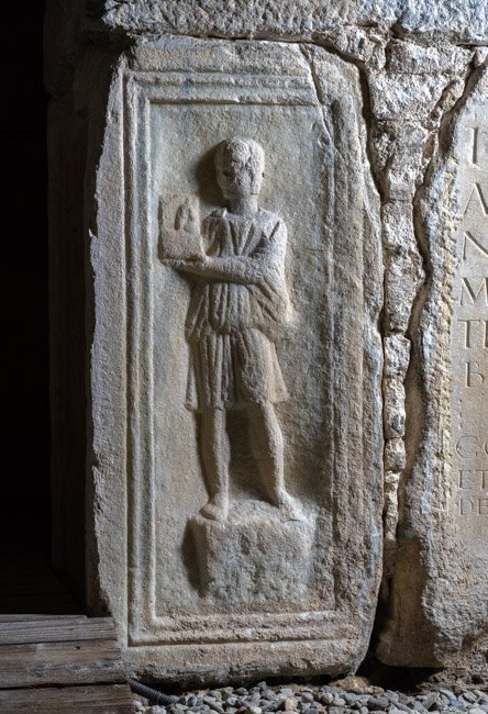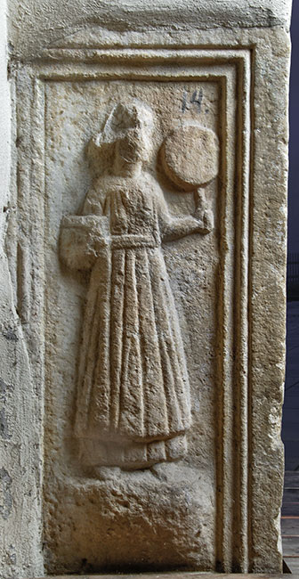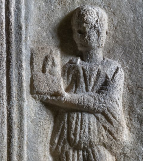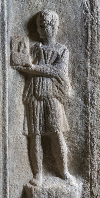 - Auf der linken Nebenseite Dienerin: in Rechteckfeld auf Podest einheimisches Mädchen in Unter- und Obergewand mit Gürtel, in der Rechten Kästchen, in der Linken Spiegel. Auf der rechten Nebenseite Diener (Librarius - Scriba): in Rechteckfeld auf Podest Mann in kurzer Tunica, schreibt mit Stilus in Diptychon.