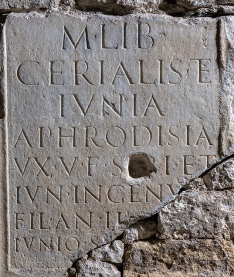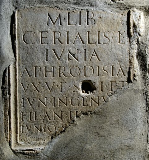 - [M(arcus) Iunius] / M(arci) lib(ertus) / Cerialis et / Iunia / Aphrodisia / ux(or) v(ivi) f(ecerunt) s[i]bi et / Iun(iae) Ingenu[ae] / fil(iae) an(norum) III [et M(arco?)] / Iunio Si[---] / I[---]