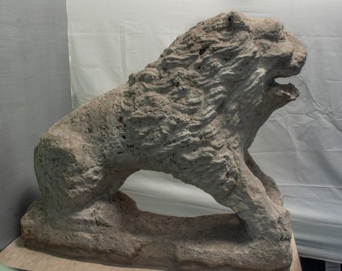 - Auf flacher Basisplatte hockender Löwe, unter den aufgestellten Vorderpranken Schafskopf.