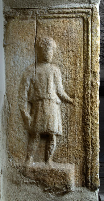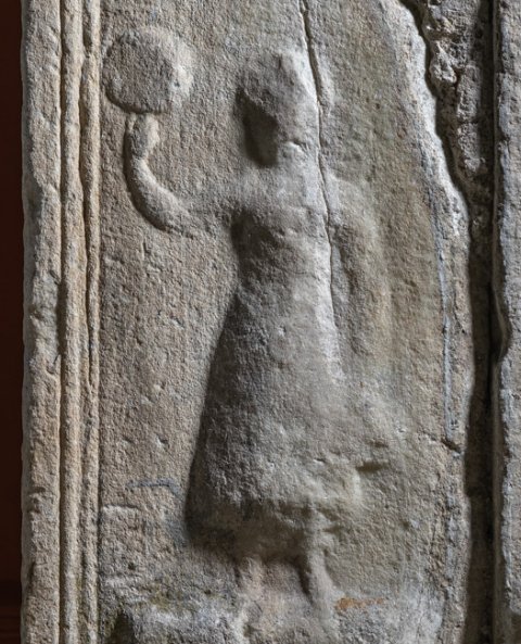 - Rahmenleiste auf der Vorderseite: seitlich Akanthuskelche, oben Ranken. Auf der linken Nebenseite Diener: auf Podest Mann in kurzer Tunica, über der linken Schulter mappa. Auf der rechten Nebenseite Dienerin: auf Podest einheimisches Mädchen in Unter- und Obergewand, in der erhobenen Rechten Spiegel, in der Linken Kästchen (?).