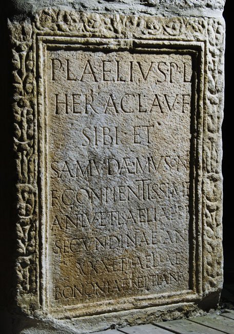 - P(ublius) Laelius P(ublii) l(ibertus) / Heracla v(ivus) f(ecit) / sibi et / Samudae Musonis / f(iliae) con(iugi) pientissimae / an(norum) LV et Laeliae P(ublii) f(iliae) / Secundinae an(norum) / XXX et Laeliae / Bononiae nepti an(norum) V