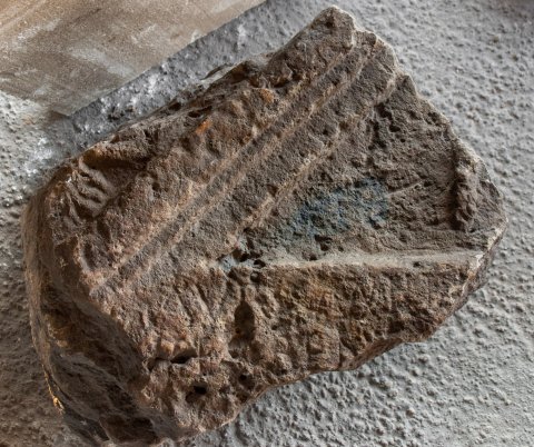 - Linke Ecke eines eingeschriebenen Giebels. Im gerahmten Giebelfeld Reliefrest. Auf der glatten Leiste unterhalb des Giebels Inschrift.