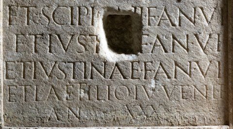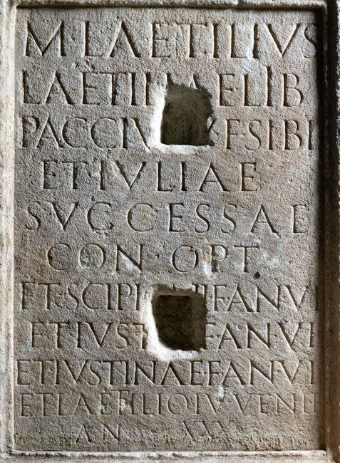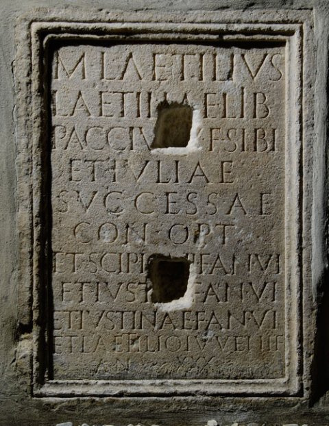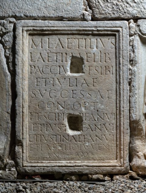 - M(arcus) Laetilius / Laetiliae lib(ertus) / Pacciu[s] v(ivus) f(ecit) sibi / et Iuliae / Successae / con(iugi) opt(imae) / et Scipioni f(ilio) an(norum) VI / et Iust(ae) f(iliae) an(norum) VI / et Iustinae f(iliae) an(norum) VI / et Laetilio Iuveni f(ilio) / an(norum) XXX
