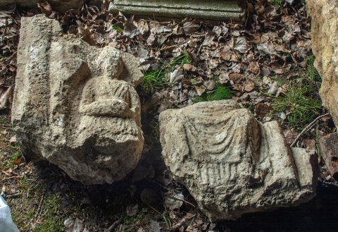 b) Unterteil einer frontal sitzenden Frau mit Ober- und Untergewand. Am Rand Reste von Halbsäulen.