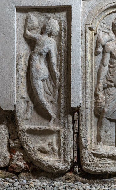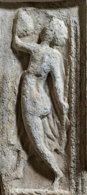 - Mythische Figuren; Frontseite: Dioskur vor seinem Pferd, das er mit der Rechten am Zügel hält; Nebenseite: mythische Figur, Musikinstrument: auf hohem Podest mit Pantherrelief tanzende halbnackte Mänade mit Tuch in Rückenansicht, in der erhobenen Linken Tympanon, in der Rechten Thyrsosstab.