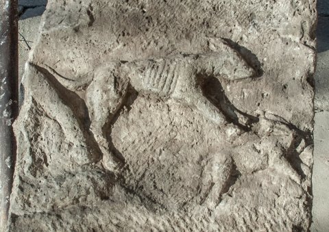 - Ungerahmtes Bildfeld zwischen grob geglätteten Flächen. Jagdszene: links Vorderbein eines Pferdes, davor Hund und Hase. Teil eines Grabreliefs ?